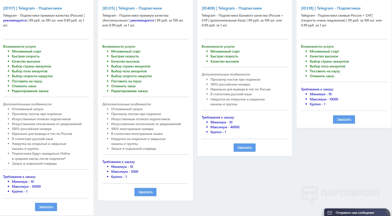 - возможности услуги (например, мгновенный старт, быстрая скорость, выбор страны аккаунтов, редактирование заказа);
