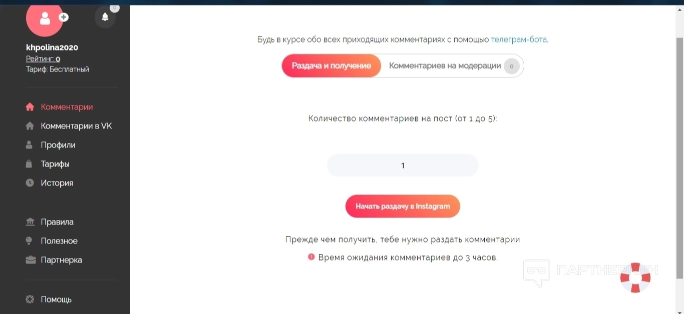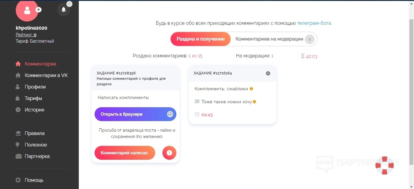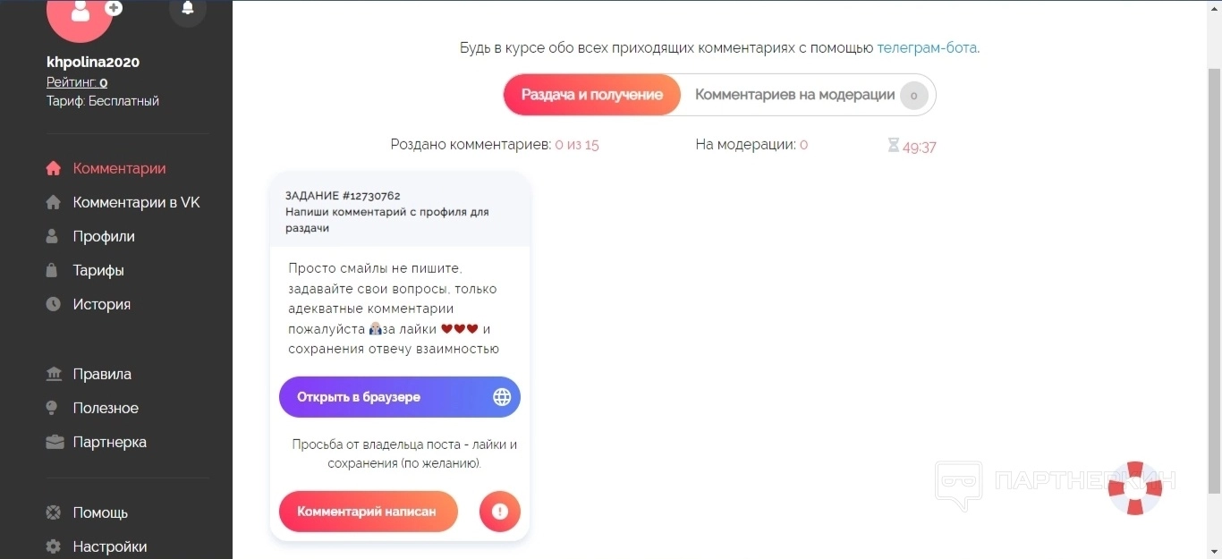 На бесплатном тарифе необходимо раздать 15 комментариев. Задания появляются в специальных окошках, в которых содержится информация о заказе — какой именно нужен комментарий и так далее.