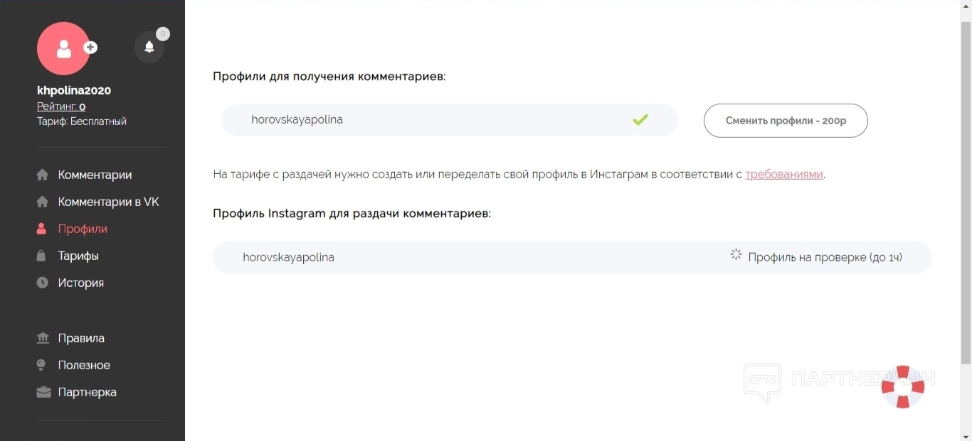 Раздел Профили отвечает за добавление необходимых для работы аккаунтов. Если выбран тариф «Бесплатный» или «Раздаю и получаю», добавлять придется только профиль Instagram*. Аккаунт ВКонтакте потребуется только при третьем тарифе, «Только получаю + VK».