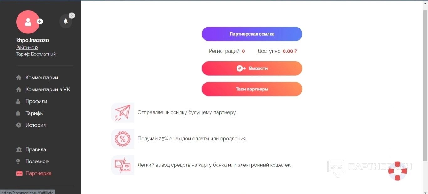 Раздел Партнерка открывает доступ пользователям к личному кабинету с реферальной ссылкой. Здесь же хранится информация о заработанных средствах, самих партнерах, а также отсюда сразу можно вывести деньги на карту или электронный кошелек.