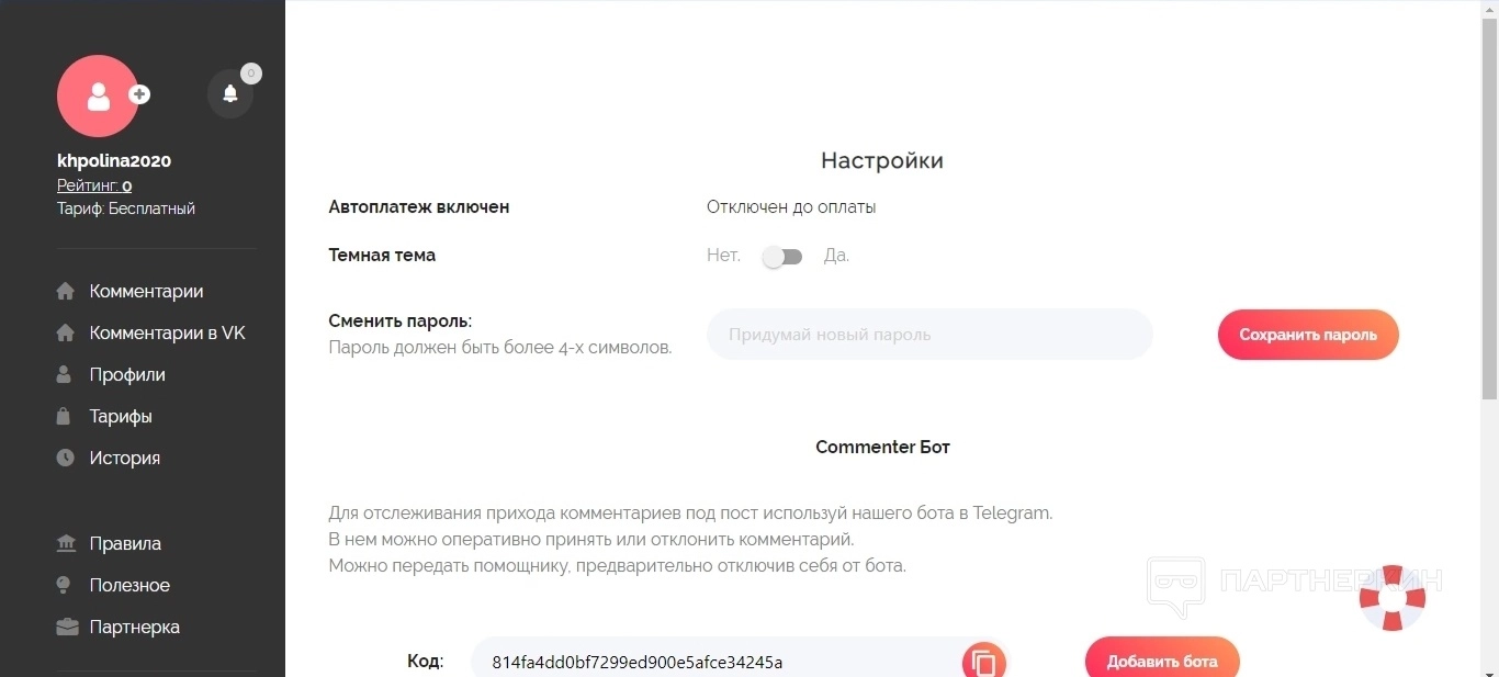 Последний раздел — Настройки . В нем пользователь может поменять пароль для авторизации в сервисе, подключить или отключить автоплатеж для продления тарифа, а также подключить специального Telegram-бота. Последний отвечает за отслеживание получения комментариев под определенный пост. Помимо этого он может также отклонить или принять полученный отзыв или передать эту возможность своему помощнику (если, например, самому некогда этим заниматься).