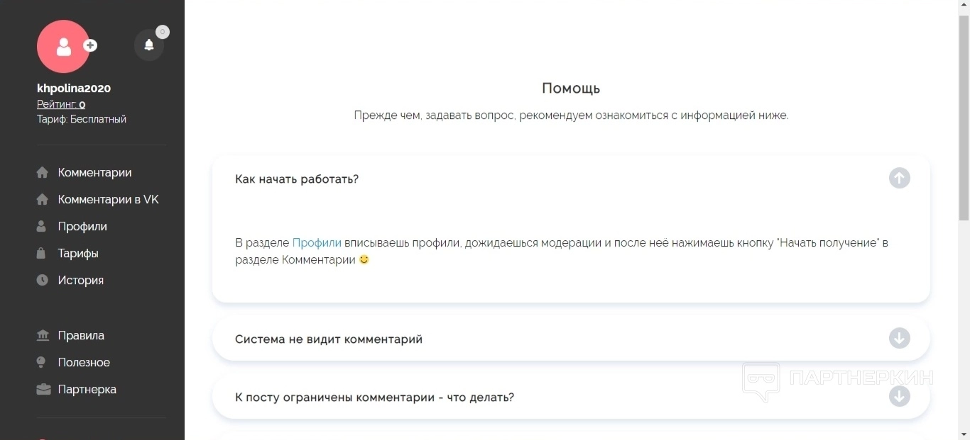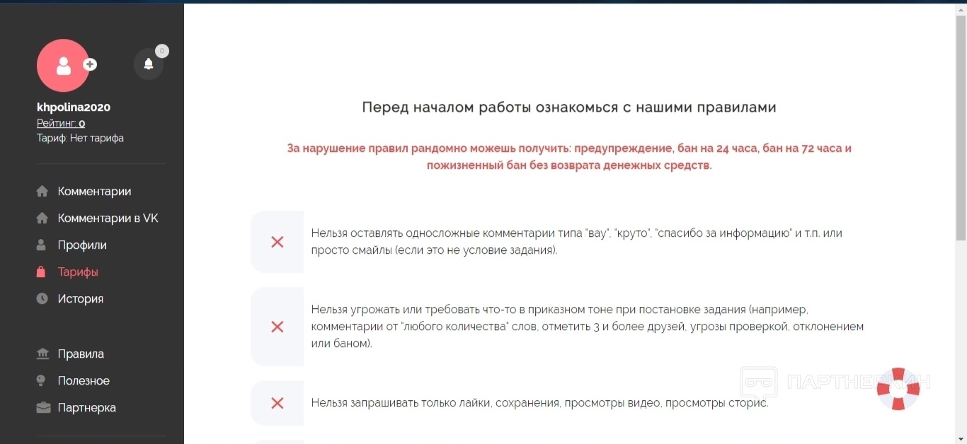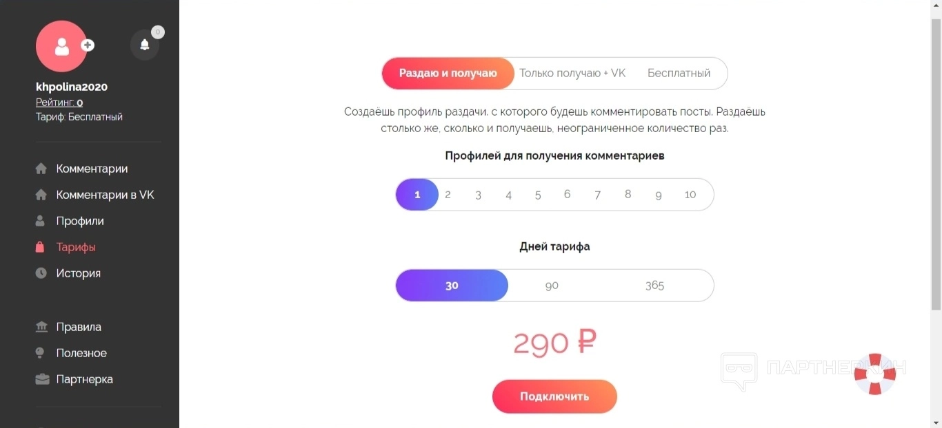 Раздел Тарифы более подробно раскрывает возможности сервиса для пользователей. Каждый из тарифов имеет свои настройки и требования, которые необходимо строго выполнять, иначе можно попасть в бан в соответствии с правилами площадки. На бесплатном тарифе есть ограничения по количеству комментариев: получить можно от 1 до 5, но отдавать всегда придется 15. Только при таких условиях им можно пользоваться бессрочно. Остальные, как уже говорилось, можно настроить под себя — сколько хочется получать и отдавать. Цена будет варьироваться соответственно.