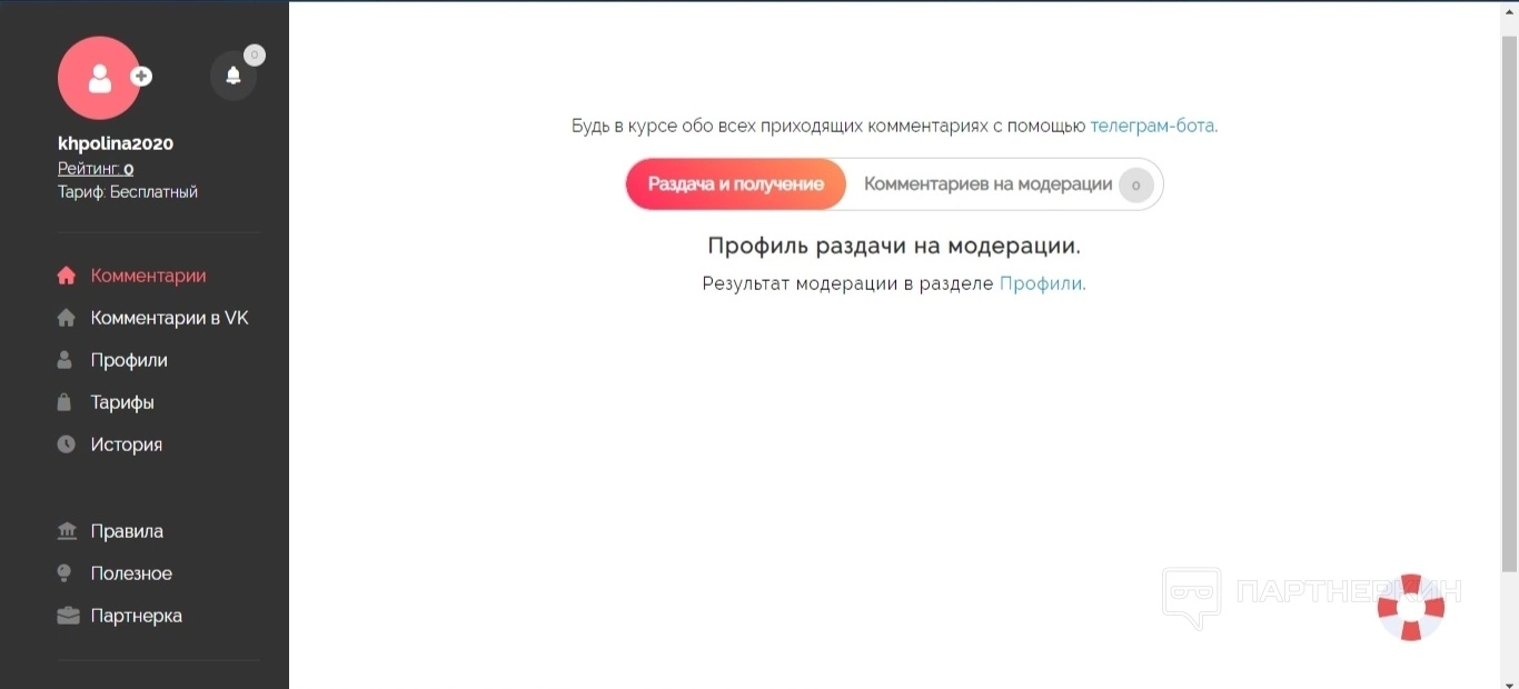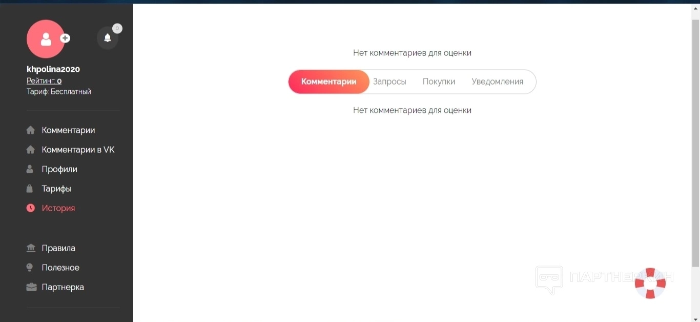 Раздел Комментарии отвечает за получение заданий для их раздачи. Также здесь можно посмотреть и статус уже готовых, которые находятся на модерации сервиса. Пока указанный профиль также не прошел проверку — раздел будет закрыт и пустовать.