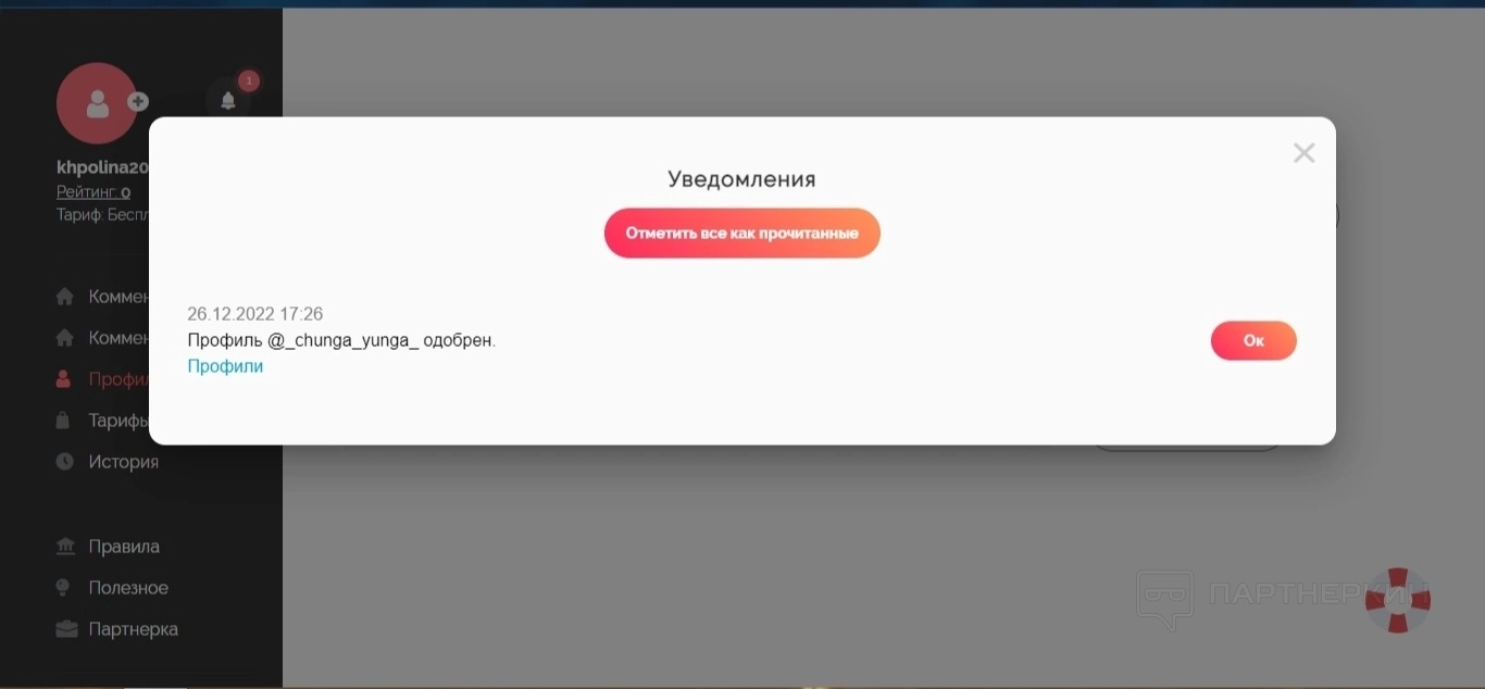 Сразу стоит отметить, что получающий и раздающий профили должны быть разными. В противном случае сервис пришлет уведомление о том, что профиль отклонен из-за несоответствия правилам.