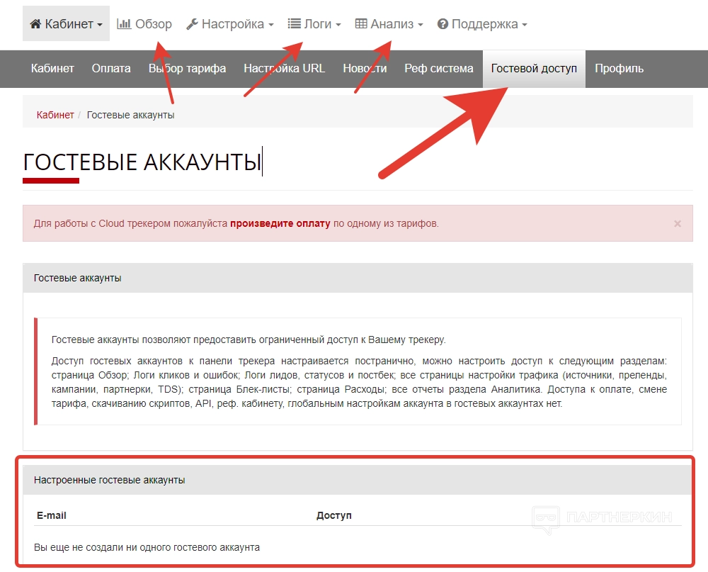 С помощью раздела « Гостевой доступ » можно выдать доступ к аккаунту другим пользователям. Приглашенные члены команды смогут использовать акк для работы со страницам « Обзор », « Логи » и « Анализ ». Доступ предоставляется путем привязки электронной почты.