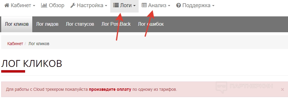 На странице « Логи » можно работать с логами кликов, лидов, статусов, ошибок и PostBack. Рядом есть страница « Анализ », где есть инструменты для анализа трафика и финансов для кампаний.