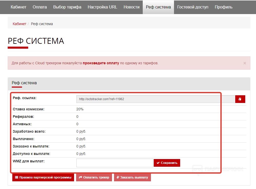 В разделе « Настройка URL » можно корректировать данные URL-трекера, однако эта процедура станет возможна только после оплаты тарифа. Если пользователь намерен организовать дополнительный доход на привлечении рефералов, следует перейти в блок « Реф система ». Там можно найти реферальную ссылку, а также информацию о комиссионных, количестве привлеченных рефералов, заработанных средств и так далее.