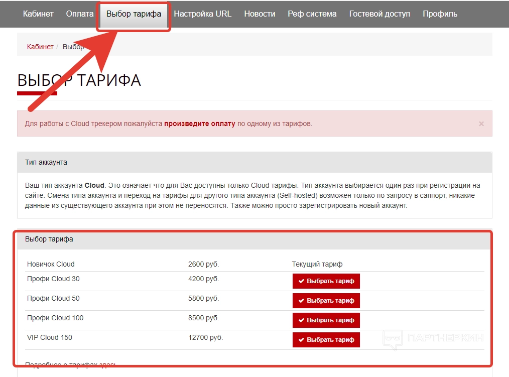 Чтобы произвести оплату, следует кликнуть на раздел « Выбор тарифа ». В нижней части экрана появится список поддерживаемых тарифных планов для созданного аккаунта.