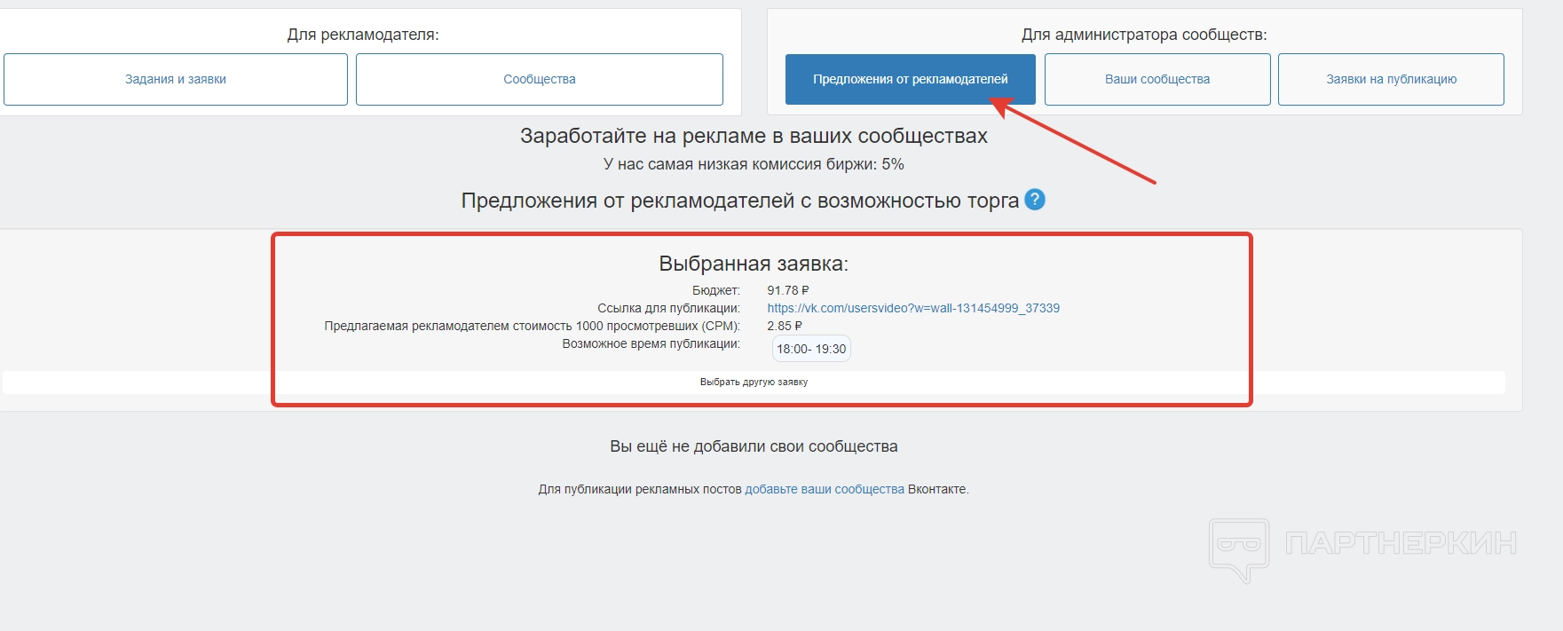 Во вкладке «Предложения от рекламодателей» можно найти готовые интеграции, за которые конкретный рекламодатель готов заплатить указанную им сумму.