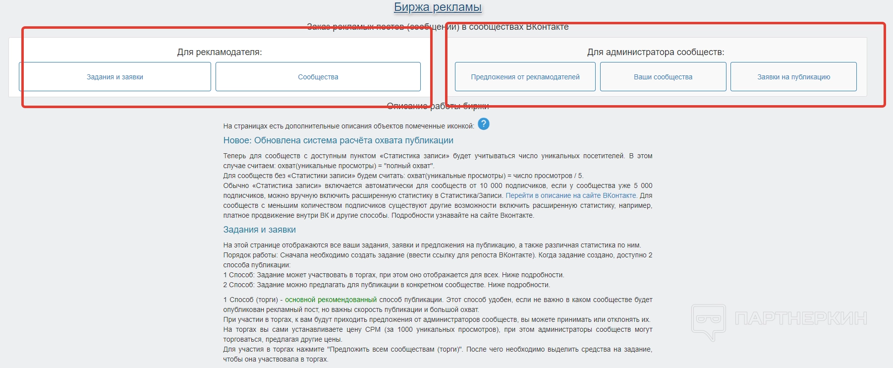 - для администратора сообществ – в этом блоке пользователь может загружать свои группы для продажи рекламных мест.