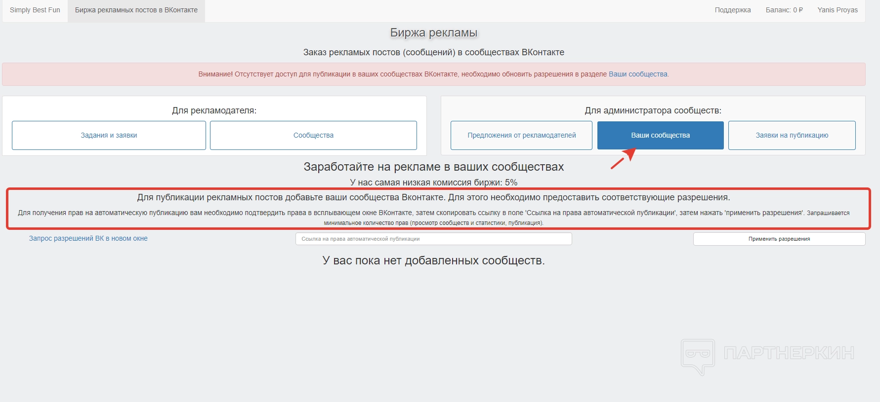 Чтобы разместить свою группу для продажи рекламных мест, необходимо в первую очередь ее добавить в сервис. Для этого заходим в блок «Для администратора» и выбираем «Ваши сообщества». Там будет инструкция, в которой прописана последовательность добавления паблика.