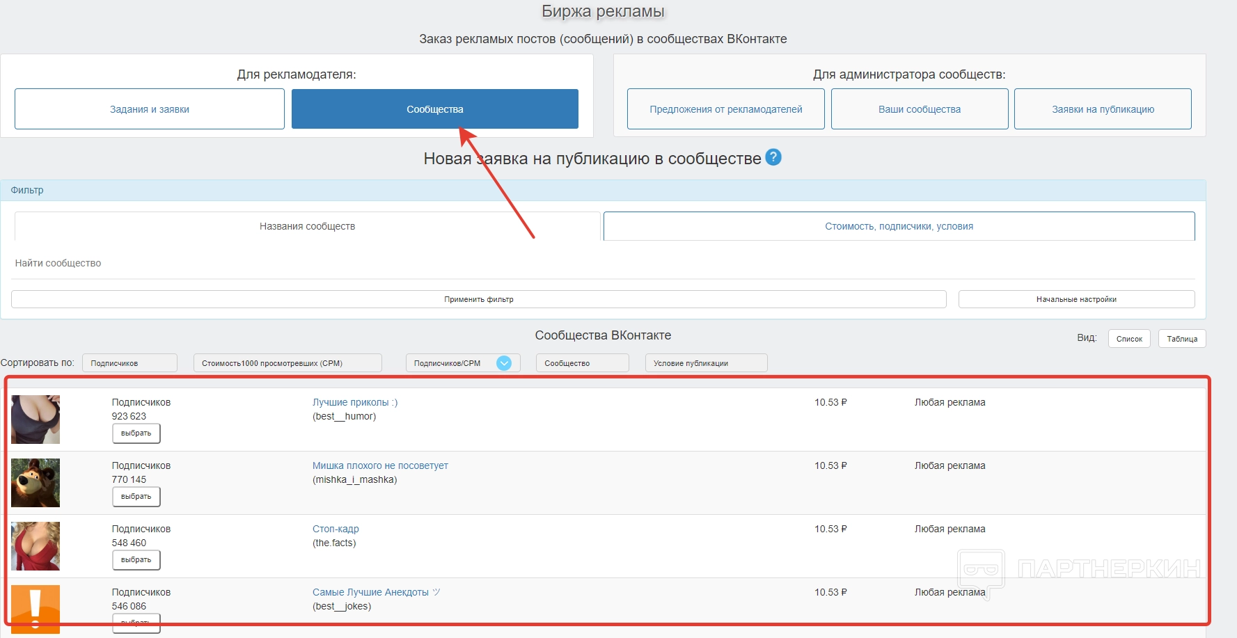 Сообщества можно сортировать по количество подписчиков, стоимости просмотра, условиям публикации и CPM.