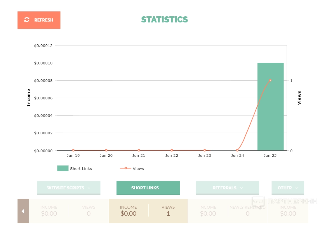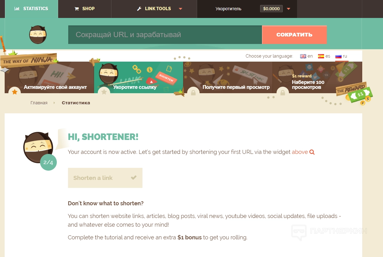 - Также упоминания стоит момент, что внутри системы есть подобие «обучающего квеста» — то есть, пользователю необходимо подтвердить адрес указанной почты с помощью перехода по ссылке из письма, создать первую ссылку, получить 100 просмотров, и после этого он получит денежное вознаграждение в размере 1 доллара. При этом выполнение будущего пункта невозможно без предыдущего.