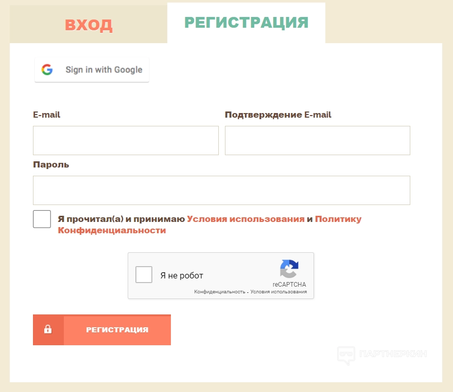 - Несмотря на то, что весь сайт максимально похож по дизайну на проект из начала 2000-х годов (Golden Bird и волшебные чайные листы, привет), это один из немногих сервисов, который поддерживает авторизацию при помощи записи в Google. Если не хочется пользоваться такой возможностью, можно ввести актуальный адрес электронной почты и придумать пароль. Интересно, что подтверждать нужно повторно не пароль, а e-mail.