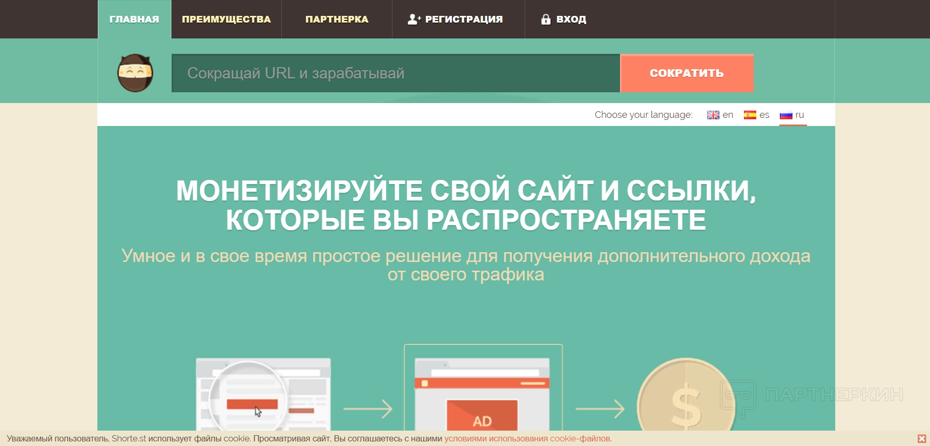 Shorte.st), выбрать русскую локализацию, если система не смогла определить верную геопозицию и нажать на кнопку «Регистрация». Стоит отметить, что проект выполнен по всем канонам сервисов подобного рода (именно заработка на сокращенных ссылках), но разработчики постарались добавить часть своего, в том числе поменяв текст на основных информационных блоках.