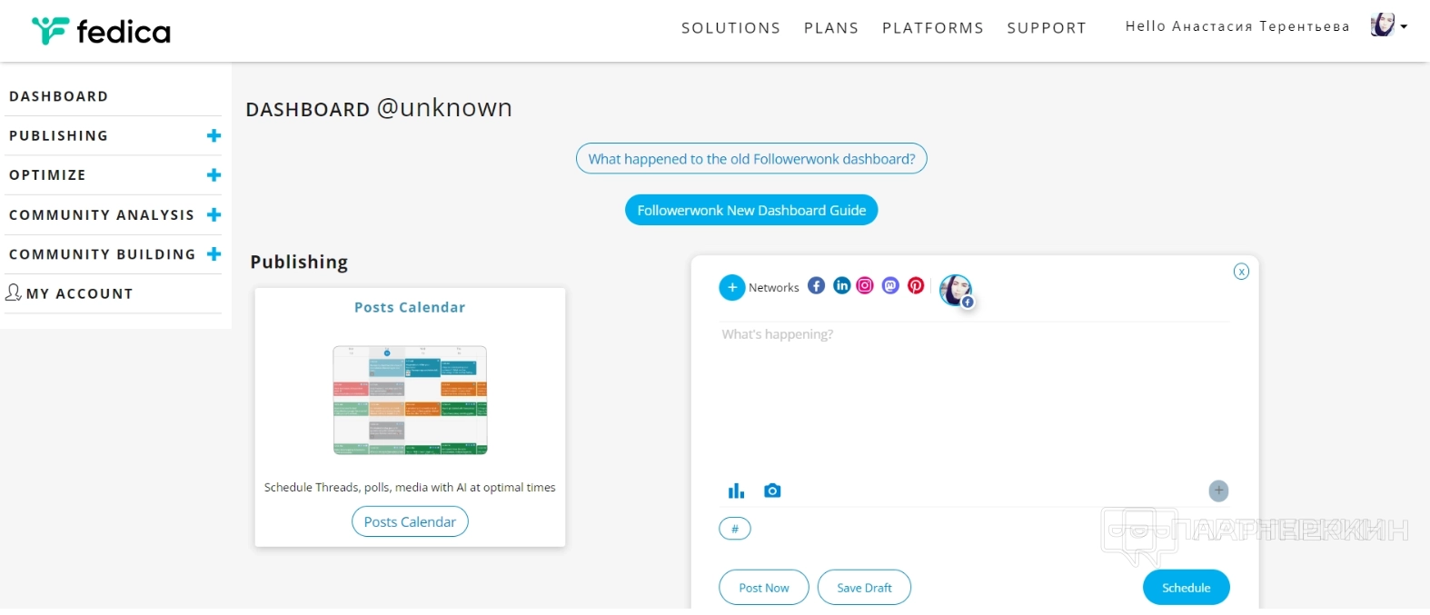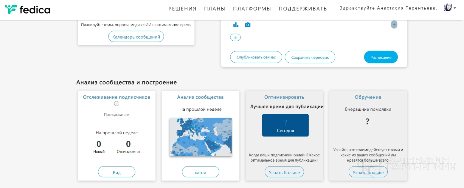 Дашборд — с помощью данного раздела можно просмотреть все основные инструменты, которые доступны пользователю. Также здесь отображается состояние подключенной страницы — например, изменения числа подписчиков за прошлую неделю и анализ сообщества.
