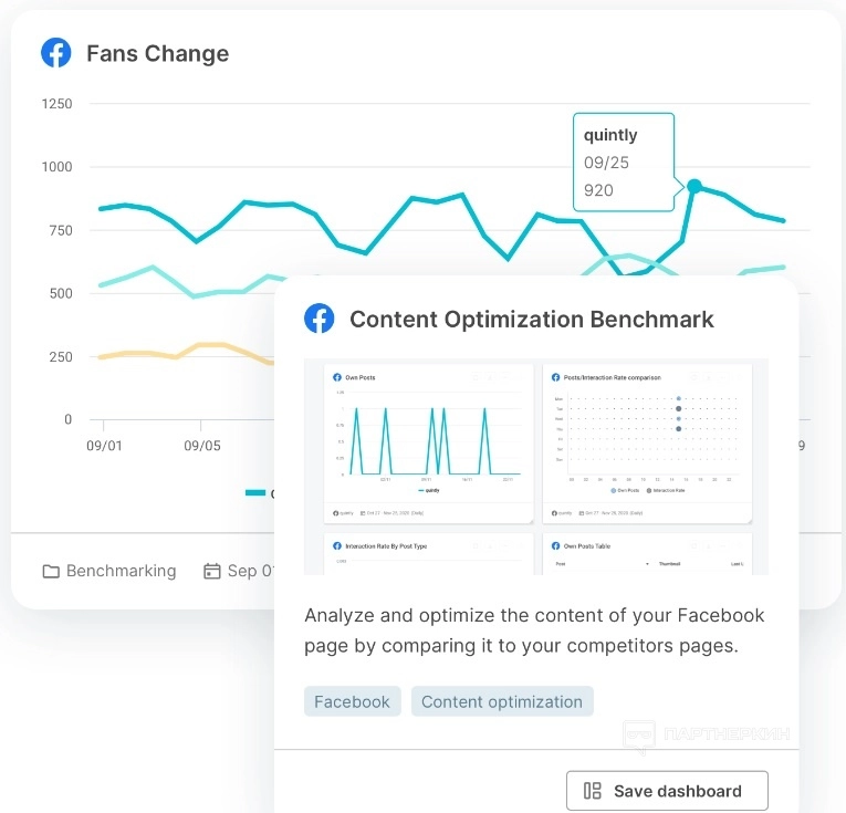 можно собирать данные о своих аккаунтах в соцсетях, таких как Facebook*, Twitter, Instagram*, LinkedIn и других. Сервис предоставляет дашборд, на котором можно просматривать основные метрики: количество подписчиков, взаимодействие с публикациями, показатели эффективности и другие. Сервис предлагает возможности анализа конкурентов, что позволяет сравнивать производительность в социальных медиа с другими компаниями в отрасли. В Quintly также можно отслеживать маркетинговые KPI, проводить анализ трендов и выбирать те стратегии, которые работают лучше всего.
