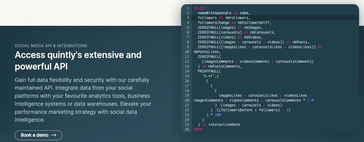 есть API, который предоставляет более гибкие и расширенные возможности использования данных и функций Quintly, позволяя интегрировать сервис в собственные процессы.