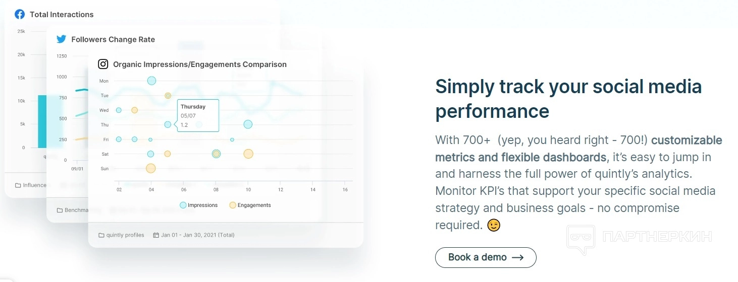 Quintlyдля мониторинга и анализа аккаунтов своих клиентов. Сервис помогает измерять эффективность кампаний, анализировать конкурентов, создавать подробные отчеты.