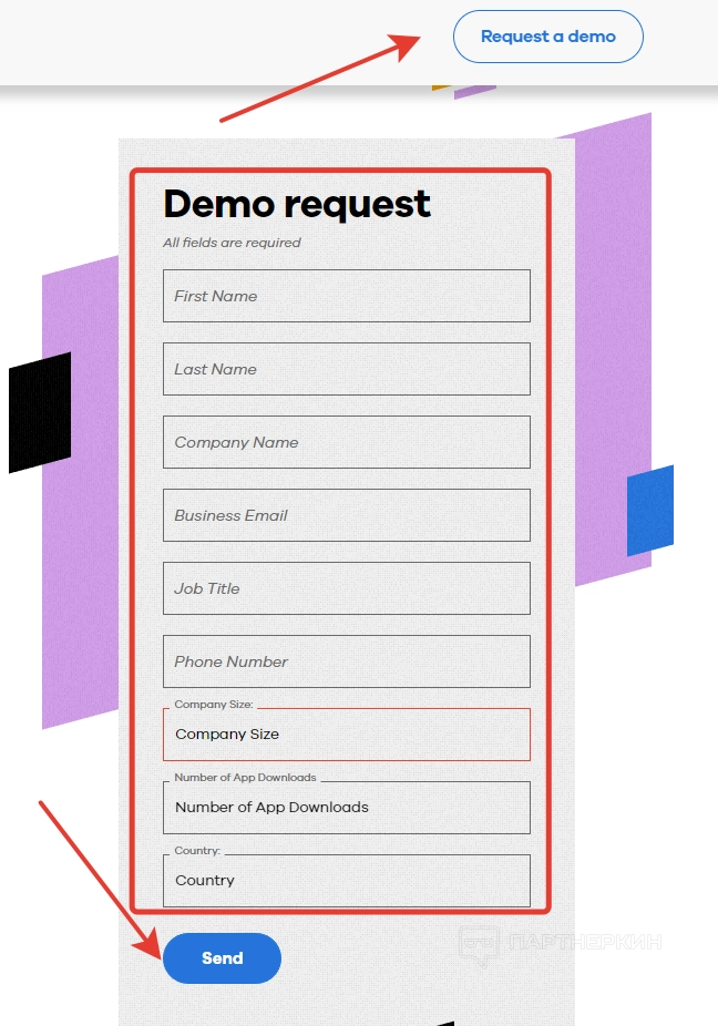 Чтобы ознакомиться с функциональными возможностями, необходимо запросить демо-доступ. Для этого открываем главную страницу, жмем на «Request a demo» и вводим следующие данные: