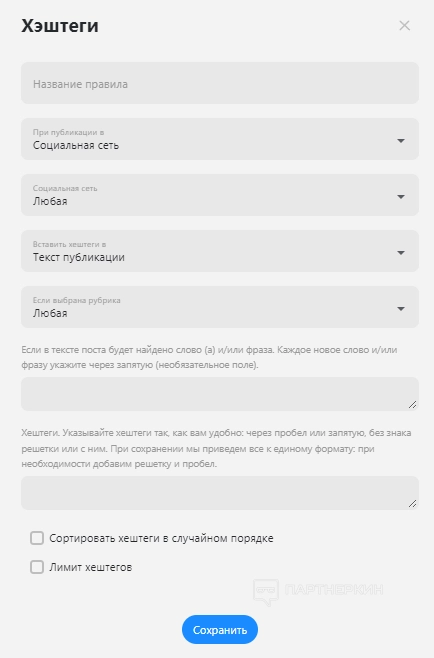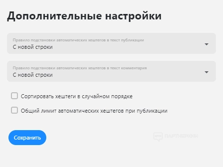 Для каждой социальной сети или аккаунта юзер может установить индивидуальные хэштеги. Они будут автоматически добавляться при создании публикации. После настройки параметров нужно нажать кнопку «Сохранить».