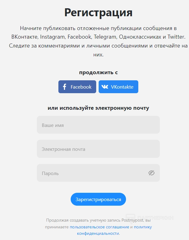 Юзер может войти в профиль через аккаунты Facebook* или «ВКонтакте». Второй способ — указать имя, электронную почту и придумать пароль.