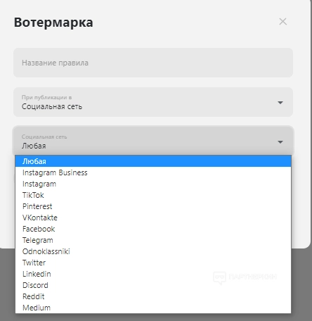 Водяной знак защищает изображения и видео в публикациях от копирования. Если пользователь загрузит свою «вотермарку», сервис автоматически добавит водяной знак ко всем публикуемым медиафайлам. Можно настроить размер, положение и прозрачность.