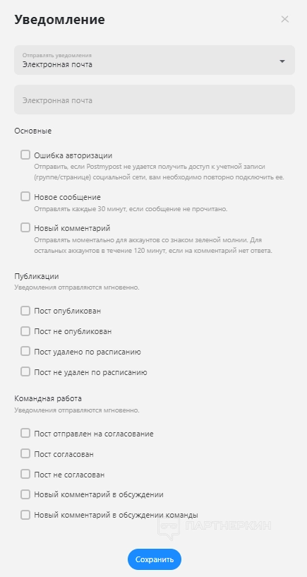 Оповещения позволят всегда оставаться в курсе последних новостей. Пользователь будет получать уведомления о статусе публикаций, новых комментариях и сообщениях в Instagram* Direct. Есть возможность настроить получение оповещений на электронную почту или в Telegram.
