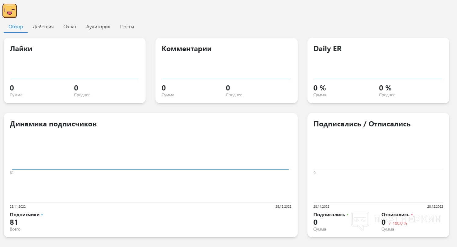 - Обзор. Здесь отображается статистика по лайкам, комментариям и динамика подписчиков. Можно посмотреть, сколько человек подписалось и отписалось за последний месяц.