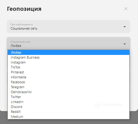 Клиент может заранее создать геолокации, которые будут автоматически добавляться при создании поста. Функция сэкономит время на рутинной работе поиска и добавления геопозиции каждый раз, когда пользователь публикует материал.