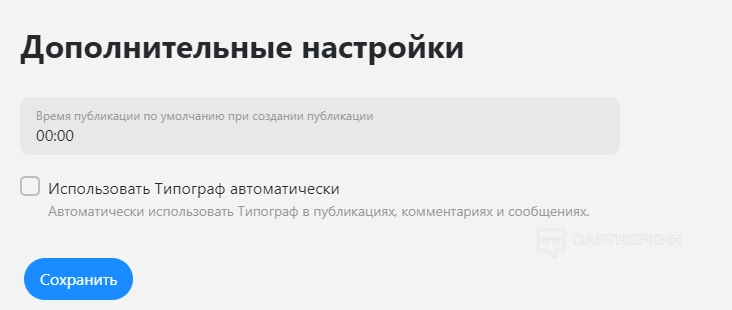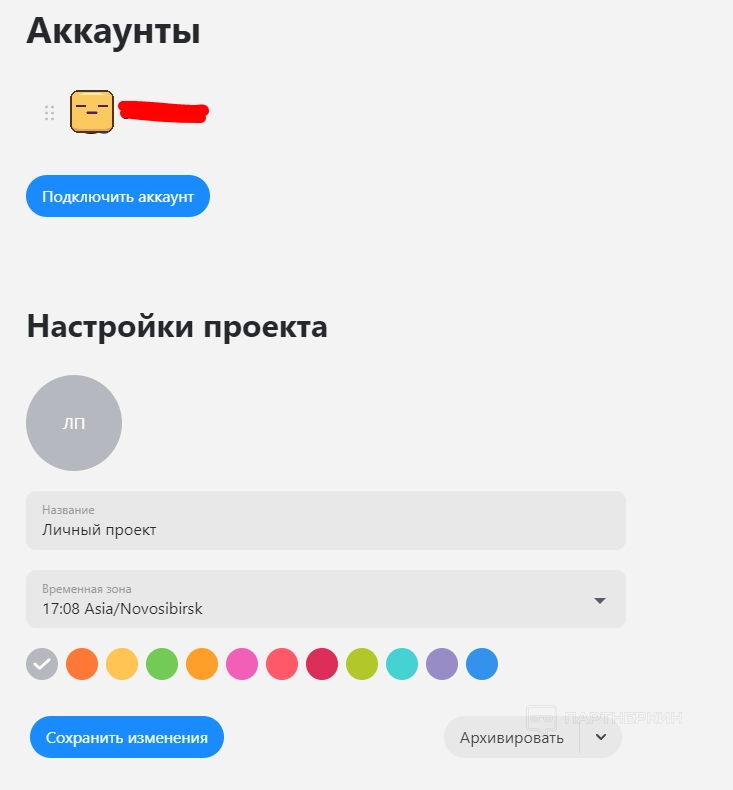 В этом разделе можно подключить новый аккаунт, настроить проект (поменять название и установить временную зону), выбрать цвет для аватара и провести дополнительные настройки (включить или отключить Типограф).
