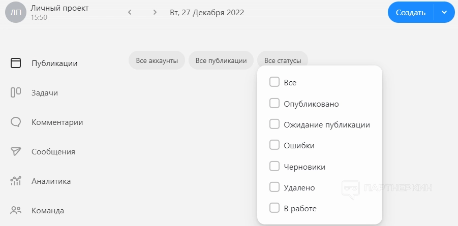 В разделе «Публикации» находятся все аккаунты пользователя, публикации (посты, истории, reels), статусы (опубликованные, ожидают публикации, ошибки, черновики, удалено, в работе).