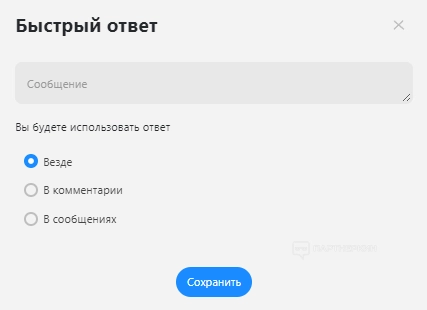 - Быстрые ответы. Опция позволяет создать шаблоны ответов на популярные и повторяющиеся вопросы, которые затем можно использовать в диалоге с клиентами.