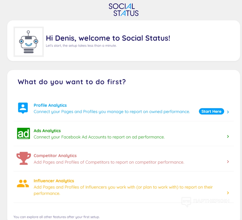 Верифицировать аккаунт не обязательно. Система сразу перебросит в окно настроек. Выберите один из инструментов и следуйте инструкциям. После настройки откроется окно личного кабинета.