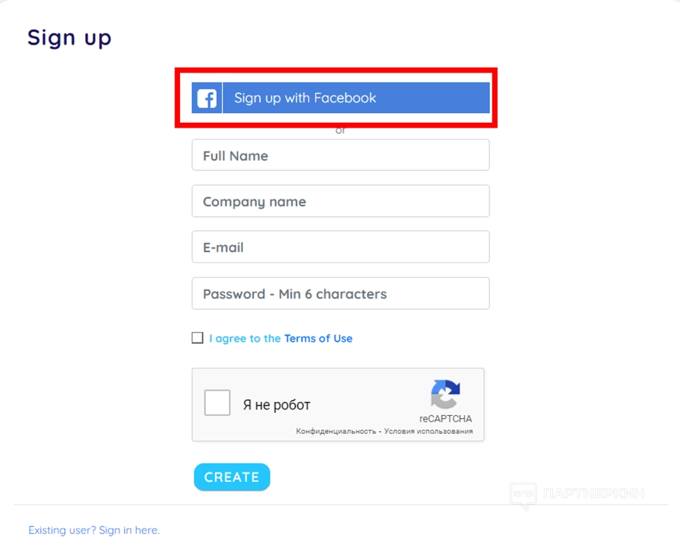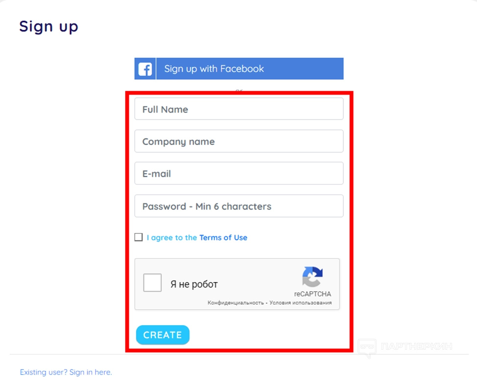 - Заполните форму : укажите латиницей свое имя, название компании, e-mail. Придумайте пароль, согласитесь с политикой конфиденциальности и пройдите капчу. В конце нажмите на кнопку Create.