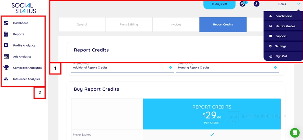 Интерфейс разбит на два отделения. В верхней части находится основное меню (1), с настройками, балансом и сообщениями. В боковой части располагаются инструменты, с которыми можно сразу начинать работать (2).