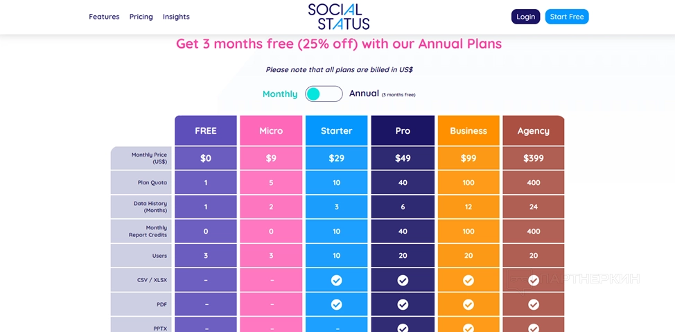 По умолчанию пользователь начинает работу с бесплатного стартового пакета. Для некоторых тарифных планов доступен триал-период на 14 дней. Оплачивать подписку можно двумя способами: каждый месяц или год. Стоимость каждого пакета находится в пределах $9-399
