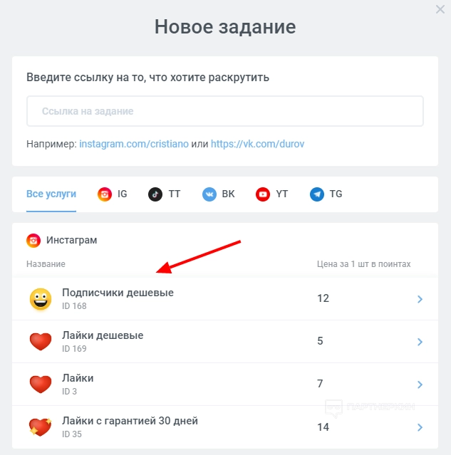 - Выбрать услугу. Для теста выберем накрутку дешевых подписчиков в Instagram*.