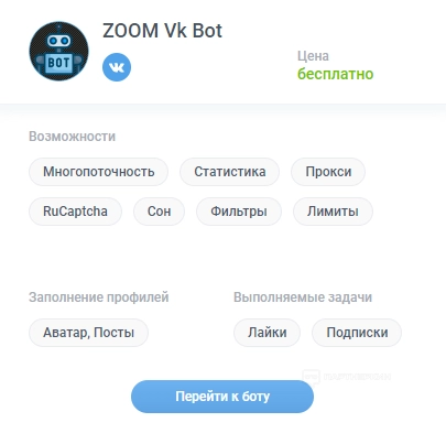 В описании каждого бота указаны возможности и выполняемые задачи. Например, с помощью ZOOM Vk Bot можно накрутить лайки и подписки.