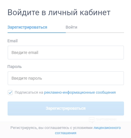 Чтобы создать аккаунт, необходимо нажать кнопку «Зарегистрироваться» в правом верхнем углу. На новой странице пользователю нужно ввести адрес электронной почты и придумать пароль. По желанию — подписаться на рекламно-информационные сообщения.