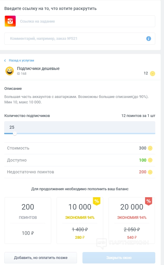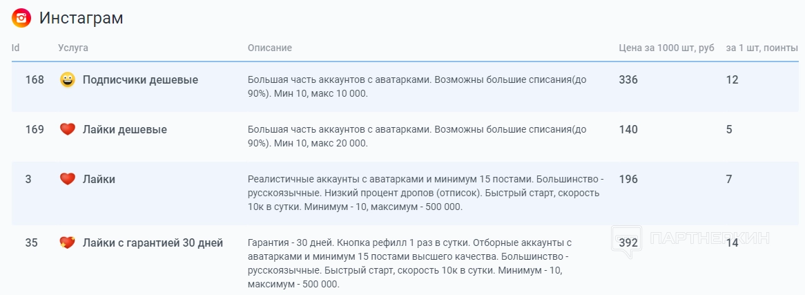 Если пользователь выберет пакет «10 000 поинтов», то вот как будет выглядеть стоимость услуг для Instagram*: