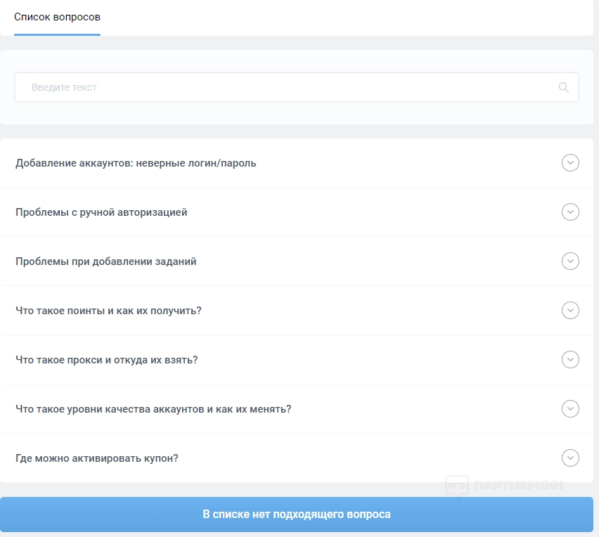 В разделе «Помощь» представлены ответы на часто задаваемые вопросы. Пользователь узнает, как добавлять аккаунты, что такое уровни качества профилей, где можно активировать купон и многое другое.