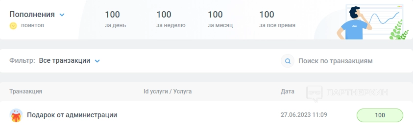 После регистрации пользователя перенаправит в личный кабинет. Система начислит 100 поинтов в качестве подарка.