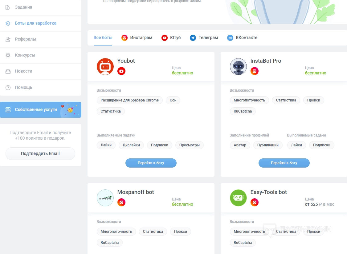 Все боты разделены на категории по социальным сетям: Instagram*, YouTube, Telegram, ВКонтакте.