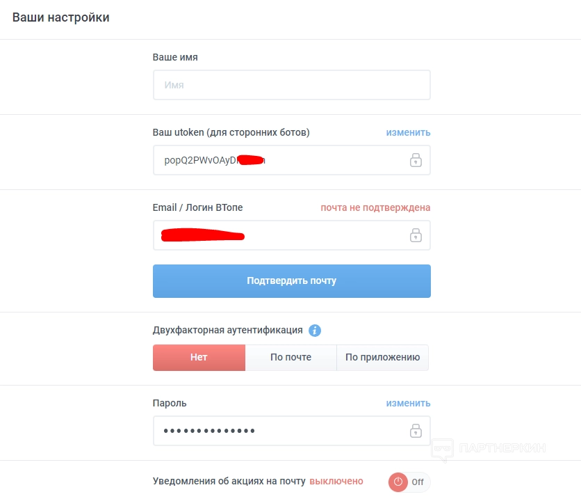 - включить/отключить двухфакторную аутентификацию — по почте или по приложению (подтверждение по email будет запрашиваться только при входе с незнакомого устройства. Подтверждение через приложение будет запрашиваться при каждом входе);