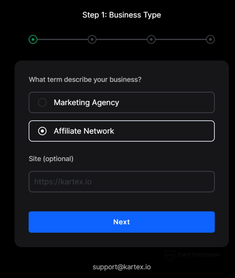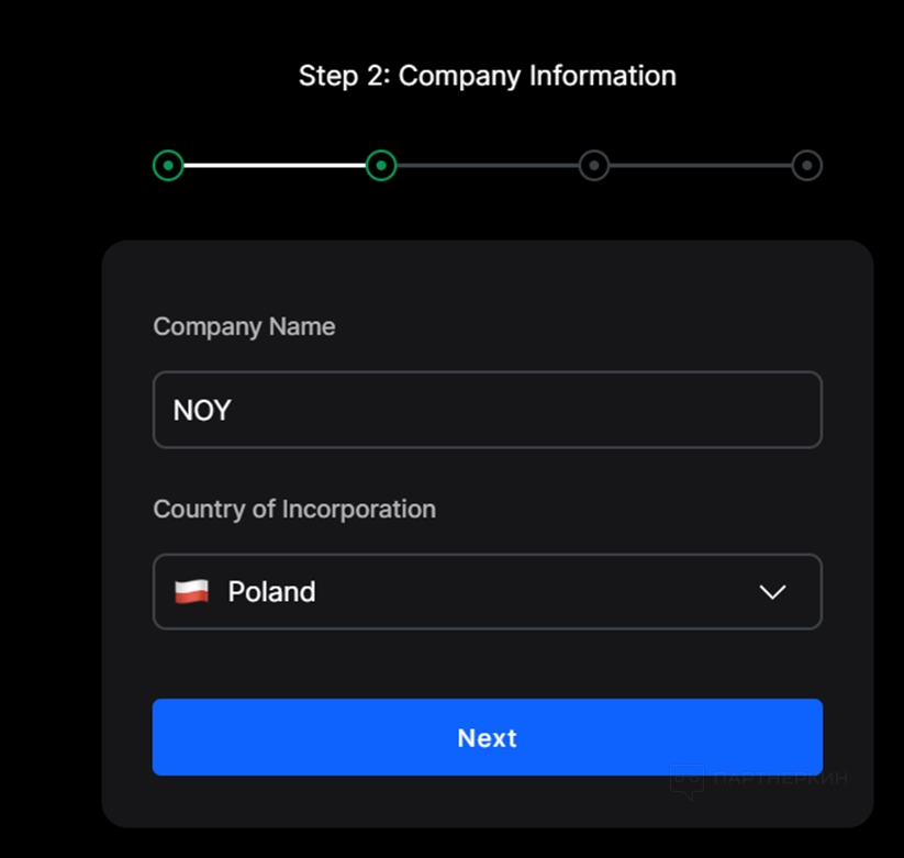 1. Выберите тип компании, добавьте сайт (можно добавить потом) и нажмите Next.