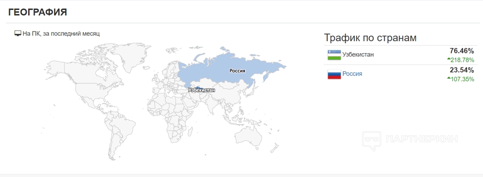 Наибольшей популярностью сайт пользуется в Узбекистане, привлекая из этой страны 76.46% трафика.