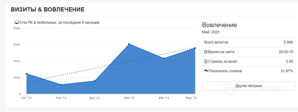 За май 2023 г. совершено 5 560 посещений. Посетитель в среднем за сеанс просматривает 0.85 страниц(ы) и проводит на сайте 10 секунд(ы). При этом показатель отказов составляет 51.97%.