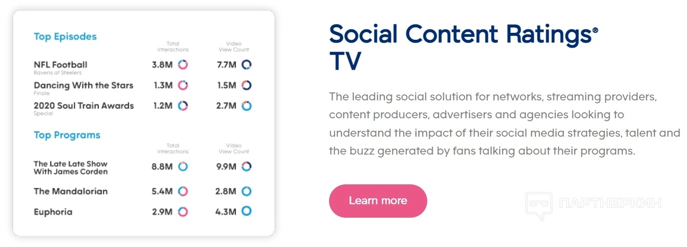 - Social Content Ratings ® — собственные наборы данных, с помощью которых можно быстро оценивать, измерять, сравнивать важные ключевые показатели.