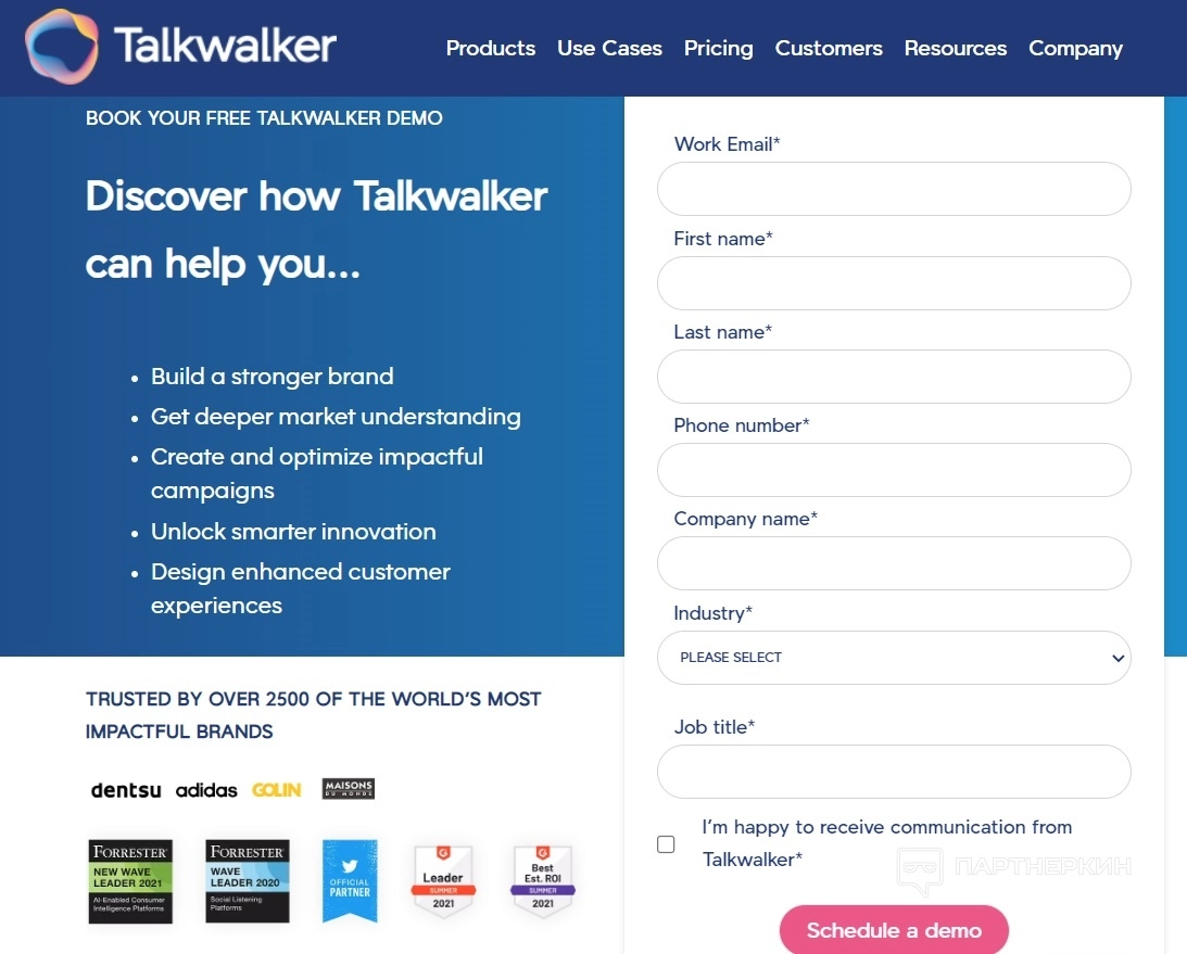 Talkwalker(www.talkwalker.com) и выбрать опцию «Бесплатная пробная версия» или «Запросить демо». Далее нужно заполнить необходимую информацию и создать учетную запись. Регистрироваться можно только от имени компании или представителя компании.https://partnerkin.com/services/default/transfer/id/1105/source/link